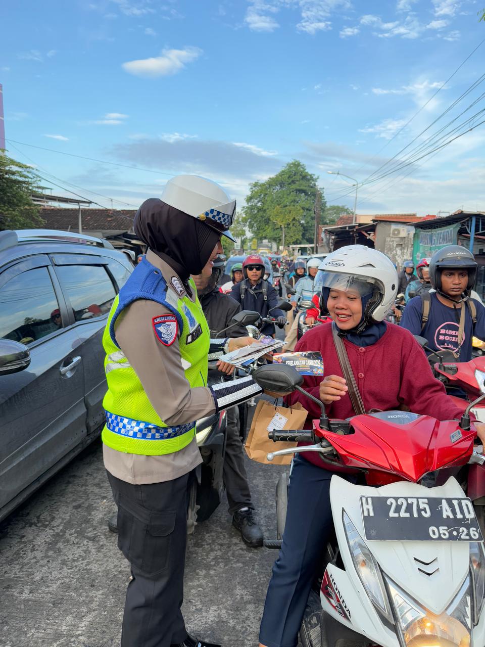 Satlantas Polres Kendal bersama Dinas Perhubungan Kabupaten Kendal memilih pendekatan edukatif dengan menyapa pengguna jalan, memberikan imbauan, serta membagikan cendera mata kepada pengendara yang tertib.